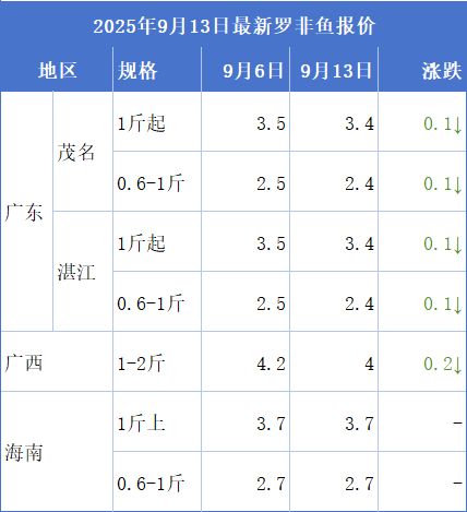 本周,加工厂收鱼量减少,养户终端价格持续走低,阳江、茂名地区1斤以上规格价格约3.4元/斤,较上周下跌0.1元/斤;0.6-1斤规格约2.4元/斤,较上周下跌0.1元/斤。广西大量存塘鱼上市,市场消费偏少,行情走弱,1-2斤价格约4元/斤。海南地区价格与上周基本持平。